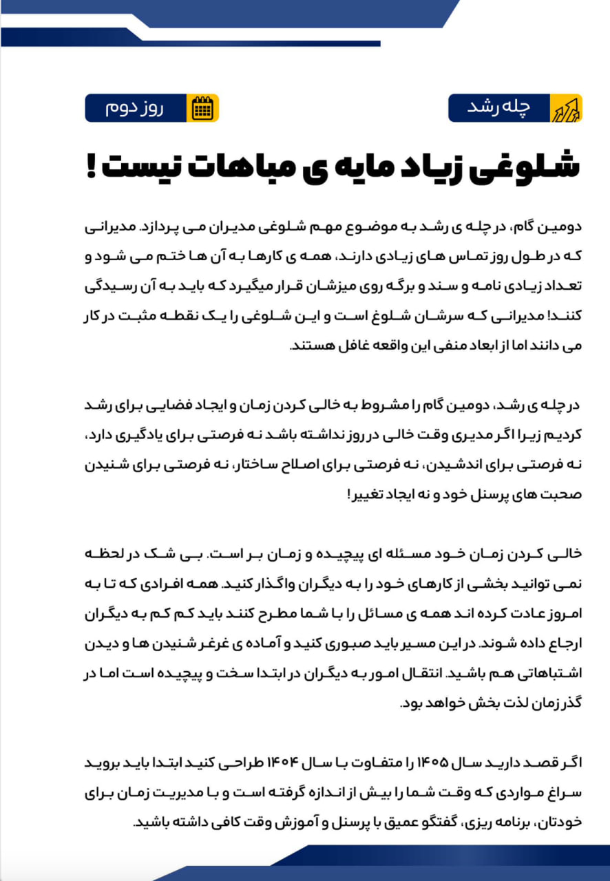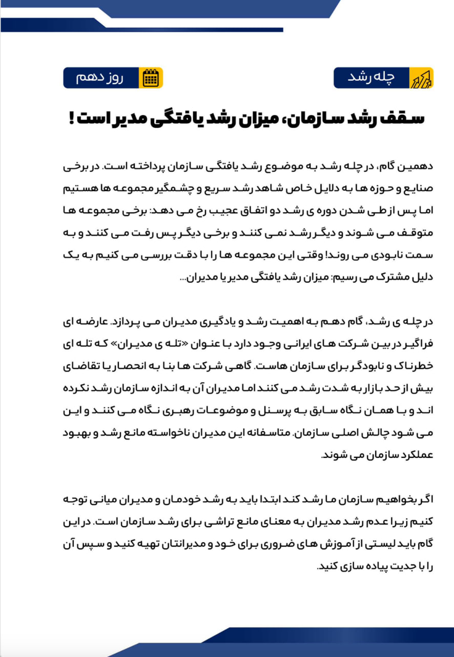 در روزگار پرشتاب امروز، رشد کسبوکار دیگر حاصل شانس یا تکرار روشهای گذشته نیست. مدیرانی موفق خواهند بود که آگاهانهتر بیندیشند، عمیقتر تصمیم بگیرند و هوشمندانهتر عمل کنند. «چله رشد» با همین نگاه طراحی شده است؛ مسیری ۴۰ روزه برای مدیرانی که میخواهند در آستانه سالی تازه، نسخهای آگاهتر، منسجمتر و قدرتمندتر از خود بسازند.